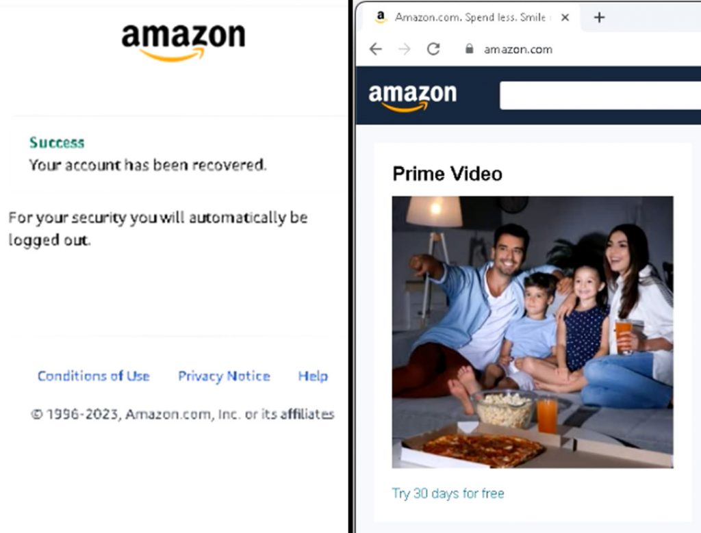 If you provide the information that is requested, you will eventually arrive at a page that says that your account has been recovered and asks you to log in again. It then redirects to the official Amazon landing page.