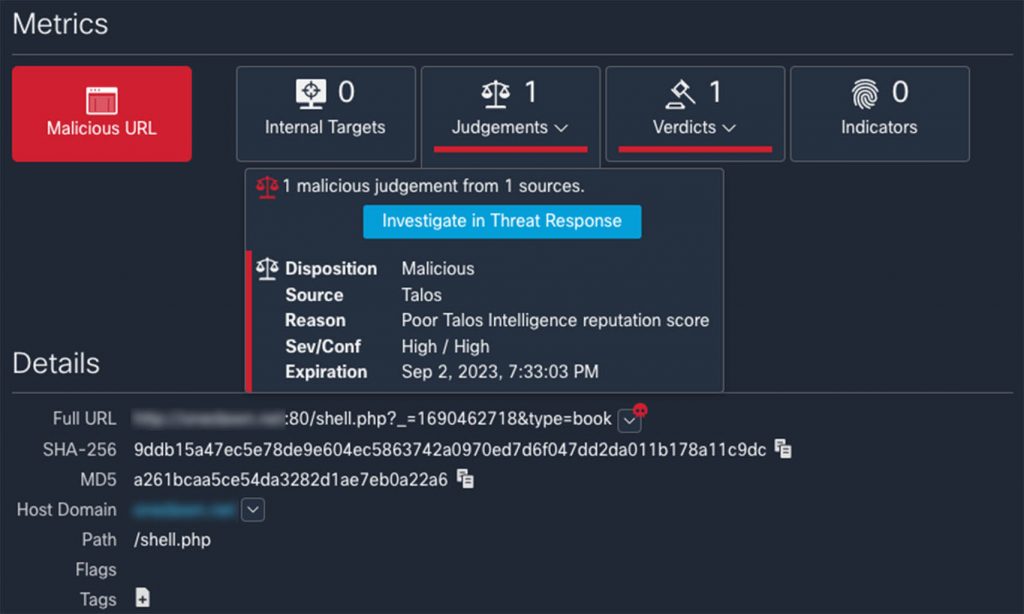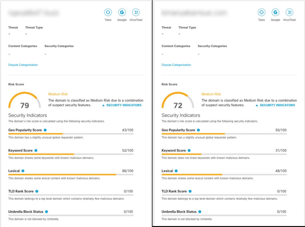 Cisco Umbrella flags this domain as a medium risk, while Talos has identified the URL as having a malicious disposition.