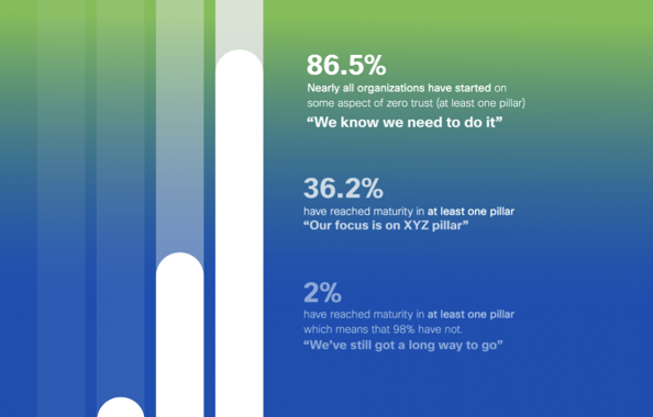 That’s the good news. The not so good news? Only a tiny sliver of respondents – 2% – claim to have achieved maturity across the zero trust pillars.