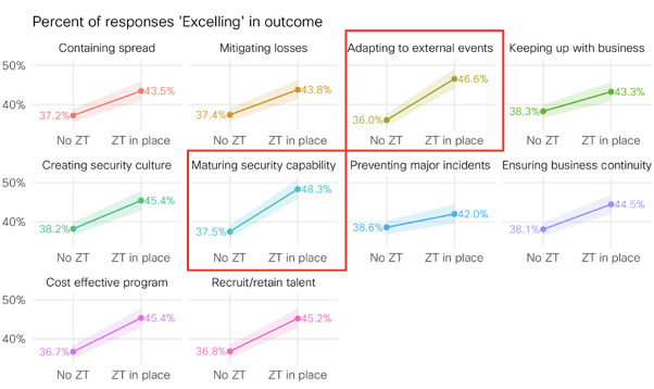 The answer lies in aligning the outcomes from zero trust programs to the objectives of the organization. Thankfully, we found zero trust improves several outcomes. From adapting to external events to maturing their security capability, organizations with zero trust in place report a double digit increase in excellence at achieving these outcomes than those without zero trust.