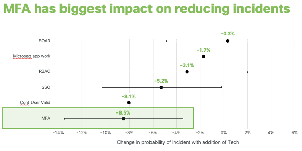 - Improved incident response. User controls like MFA have the biggest impact on reducing incidents highlighting the value these preventative controls can have on the productivity of SecOps teams. Fewer incidents is good news for all.