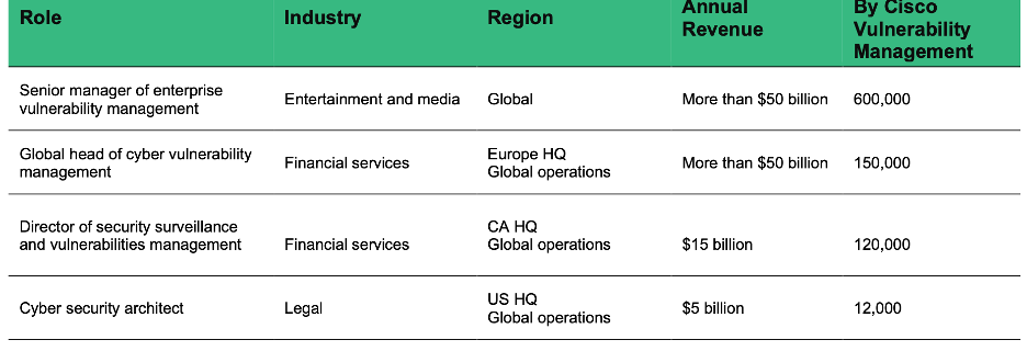 Forrester interviewed five Cisco Vulnerability Management customers (Figure 1) and formed a composite organization based on their characteristics to analyze the financial and operational impacts of Cisco Vulnerability Management. The composite organization is a global organization with $10 billion in annual revenue, 100,000 assets covered by Cisco Vulnerability Management, and 10 security analyst FTEs.