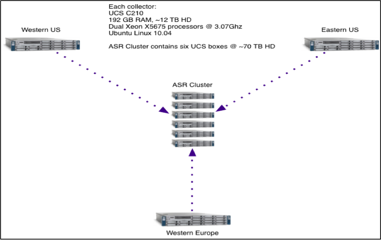 Each remote collector was based on the Cisco Unified Computing System servers (UCS 210) with attached storage. Each collector has 12TB of storage to store locally collected network traffic. Processing at each collector extracted meta-data from the raw packet capture data and transmitted it to a central storage location in one of Cisco’s East Coast campus locations.