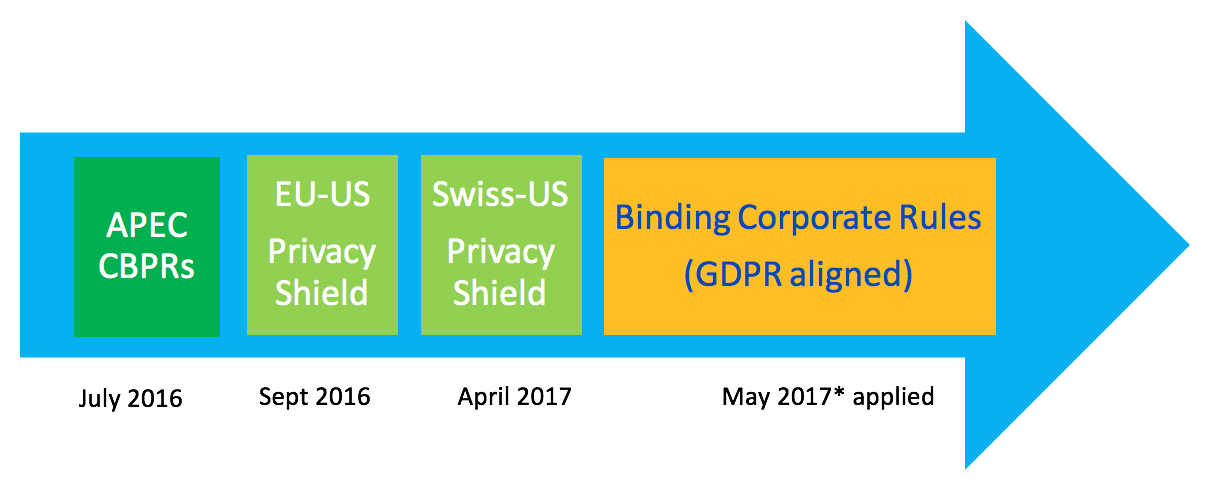 These principles align to internationally recognized privacy guidelines, frameworks, and laws such as the OECD Guidelines, EU/Swiss-US Privacy Shield, EU Binding Corporate Rules, GDPR, Japan’s Act on the Protection of Personal Information, Singapore’s Personal Data Protection Act, Korea’s Personal Information Protection Act, and others. To ensure a consistent baseline of privacy protection when data processing crosses borders, APEC created the Cross-Border Privacy Rules system (CBPRs). Like the EU’s BCRs and Privacy Shield, companies can certify under the CBPRs and publicly commit to honoring the CBPRs principles no matter where data processing takes place. An APEC-approved, independent third party, called an Accountability Agent, reviews the company’s policies and practices to verify compliance and issues the certification. A CBPRs-certified company is permitted to transfer and receive personal data collected in an APEC member economy across borders (i.e., the certification satisfies Japan’s new cross-border restrictions).