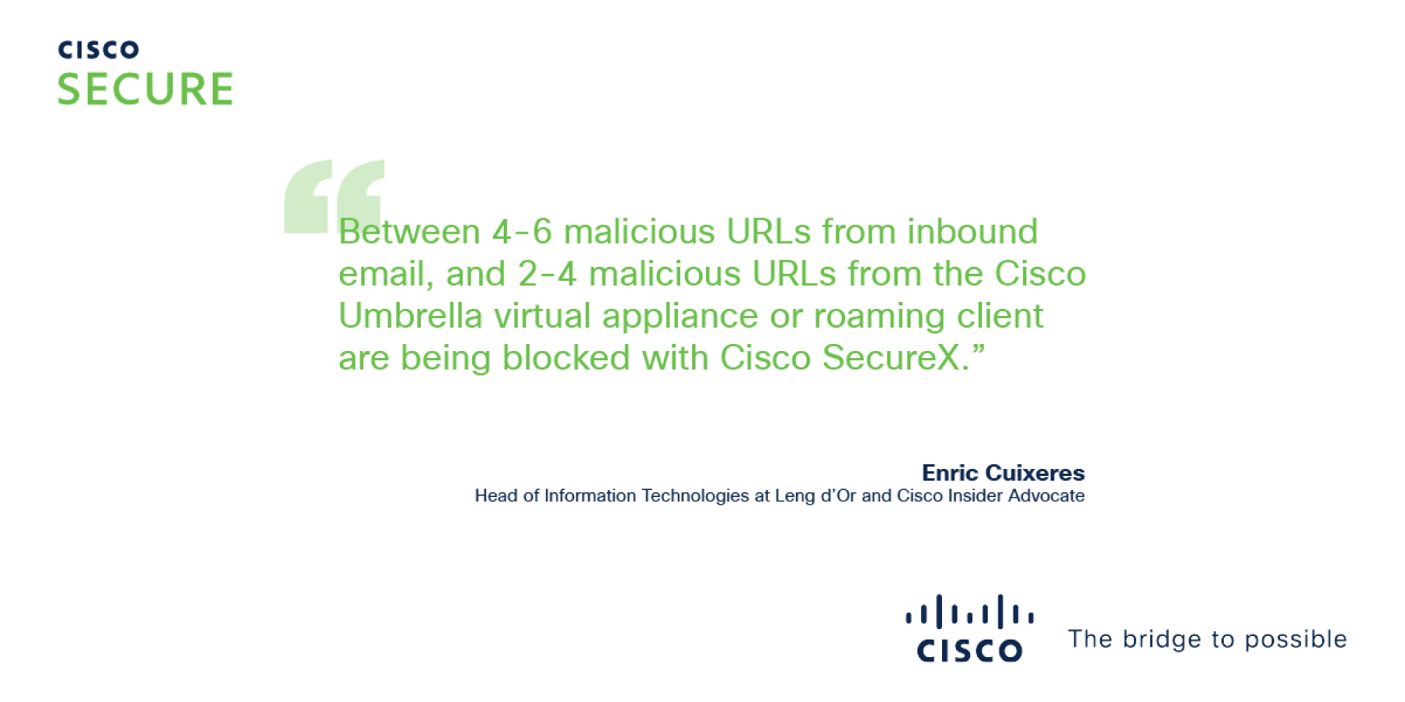Enric: Leng-d’Or reduced the time to detect threats by 90% thanks to the single pane of glass provided by Cisco SecureX. During a one-week period, there were between 2-5 confirmed threats blocked.