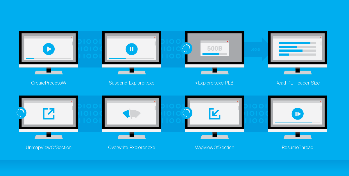 - Overwrite image sections of Explorer.exe with unpacked (of the current step) executable code