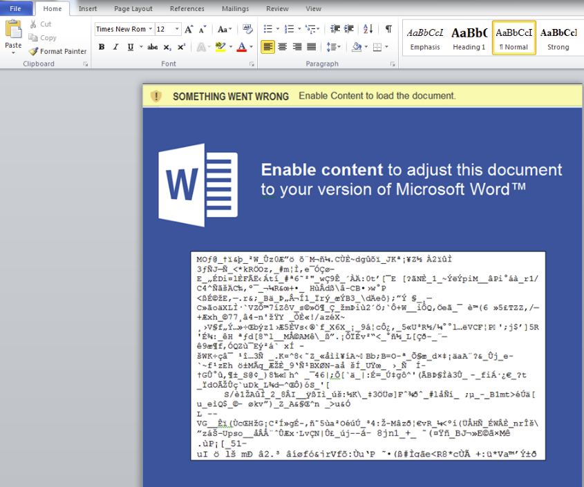 Upon opening the document, the attacker attempts to social engineer the user into executing the malicious macro content by stating it will adjust to their version of Microsoft Word: