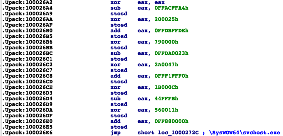 The result of these operations produces the path to the WOW64 version of svchost.exe. We’ve written an IDAPython script to automatically decode these strings from a provided address starting with the XORing of EAX, performing operations on the DWORDs involved up to a certain “depth” (as strings vary in length), and adding the resulting string as a comment next to the next instruction head.4