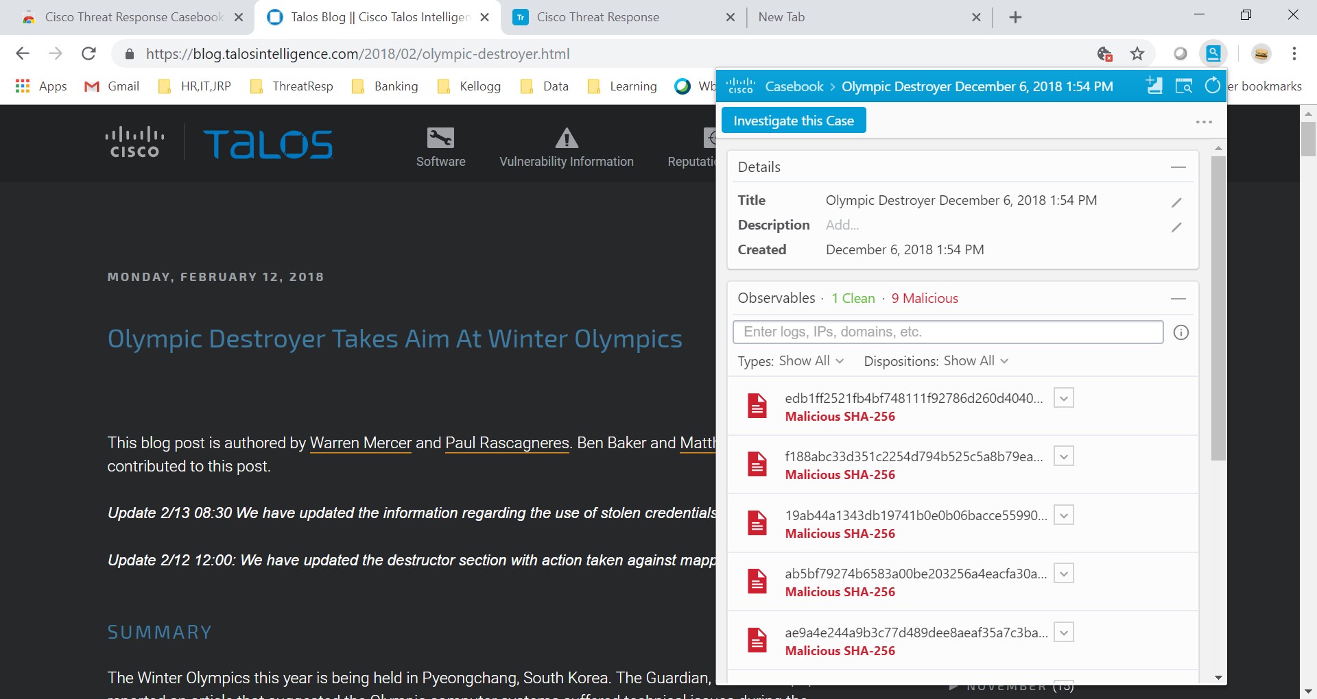 One of the most popular features is the browser plug in we’ve developed that takes unstructured data from any webpage or application, finds the observables or indicators of compromise and automatically renders a verdict on that observable (clean, malicious, unknown) based on our threat intelligence. Like that Talos blog example we used earlier: one click pulls all the observables mentioned on that page without the need to manually cut and paste each one (and there are 634 observables mentioned – I had them counted!) Moreover, you can access the Threat Response pivot menu, including domain blocking, without ever leaving the page.