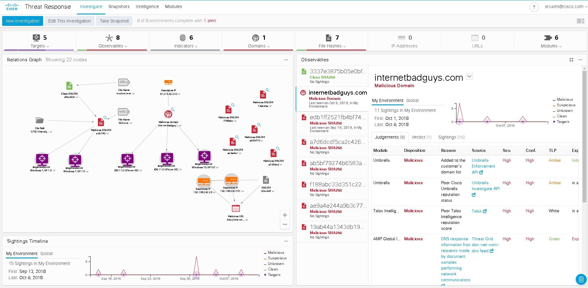 Cisco Threat Response calls threat intelligence APIs to gather the all the dispositions for each one at once. Then it calls the Cisco Security products’ APIs and learns what each one knows about every observable. Cisco AMP for Endpoints knows what systems have the malicious file hashes. Cisco Umbrella knows which devices called out to malicious domains. Integrating your Email Security Appliance (ESA) lets you know who received that attachment or phishing URL and so forth until it gathers everything necessary to show you exactly what is happening in your environment.