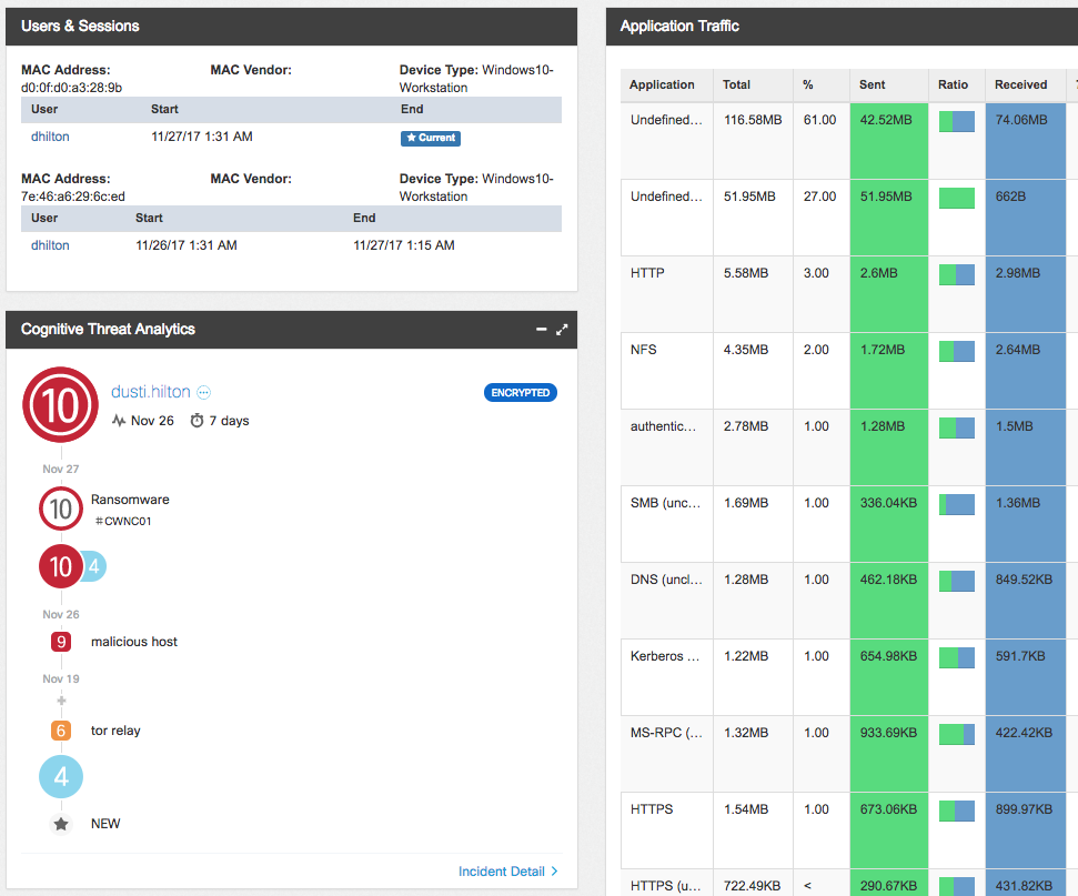 Along with this new meta data the team developed a machine learning algorithm that uses that meta data to evaluate and report on the likelihood that a particular encrypted communication between two hosts might contain malware. The Stealthwatch Flow Collector sends meta data about connections that travel between a protected network and the Internet to the Internet based Cisco Cognitive Threat Analytics data center. The Cognitive Threat Analytics team has adapted this research to work within their production system and the resulting risk scores are returned to and appear as a feature of the Stealthwatch Management Console.