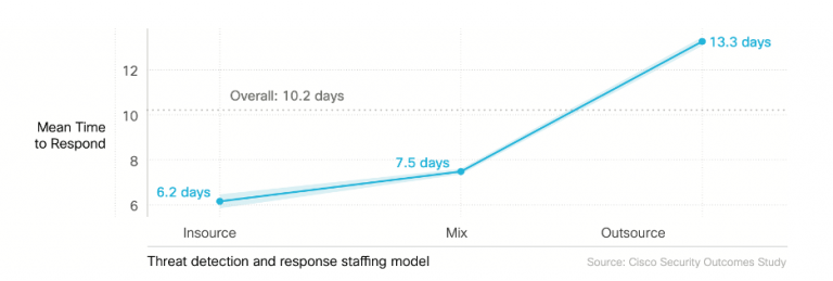 The Security Outcomes Study, Vol. 2, found that outsourced detection and response teams were seen as being superior, while the actual numbers told a different story. Internal teams demonstrated a faster mean-time-to-respond of 6 days versus the13 days of an outsourced approach.