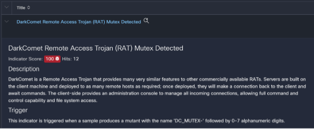 We analyzed a recent DarkKomet sample that was submitted to Cisco Secure Malware Analytics. The sample communicated with dl.dropbox[.]com over TLS using the default Windows TLS library, and EVE correctly classified the connection as originating from a malicious executable. While most traffic using the default Windows TLS library is benign and most traffic destined to dl.dropbox[.]com is benign, the combination of the two features skews heavily towards malicious binaries over the past several months and EVE’s machine learning backend leverages these trends.