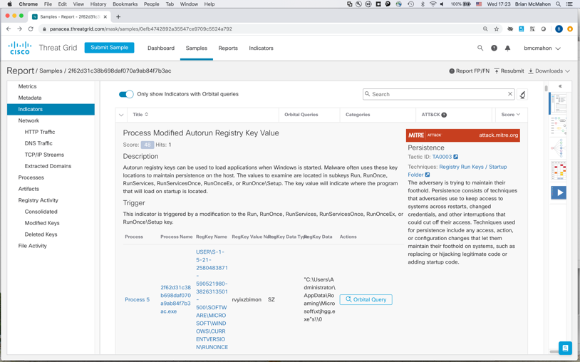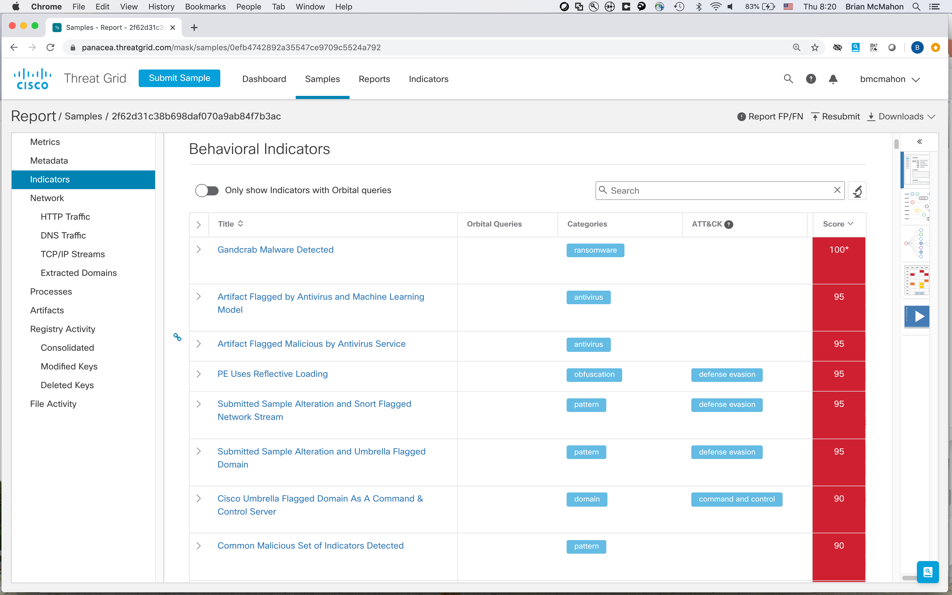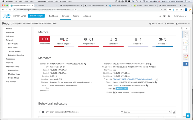 Sam is close to the Aha moment! He drills down to understand the behavioral indicators in Threat Grid. He gets every scrap of detail about this threat artifact. And sure enough, there’s our C&C connection. Victory!