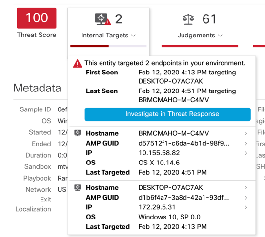 But Sam wants more. Threat Grid also shows him the internal target that might need further analysis. It analyzes the files and suspicious behavior across his environment to deliver context-rich malware analytics and threat intelligence. Now that he is armed with insights into what the file is doing, he is ready to explore how this threat has impacted the network. Sam kick starts a threat investigation for observed internal targets in Cisco Threat Response using the Browser Plugin. The Plugin enables Sam to research any observable (e.g. Domain, IP-address, File-Hash, URL, etc.), on any HTML-based webpage, in Chrome. Interested in what Sam is doing? See how you can configure the plugin, here.