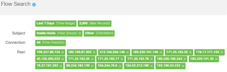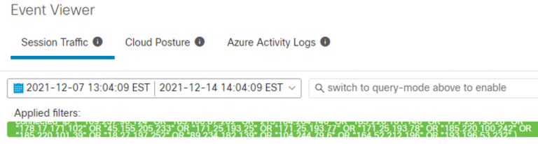 Users should perform a Flow Search going back at least 7 days for the IP’s provided by Talos. Exploitation was first detected on December 9, 2021, but it is possible that activity was happening prior to this date. Consider searching back further than 7 days.