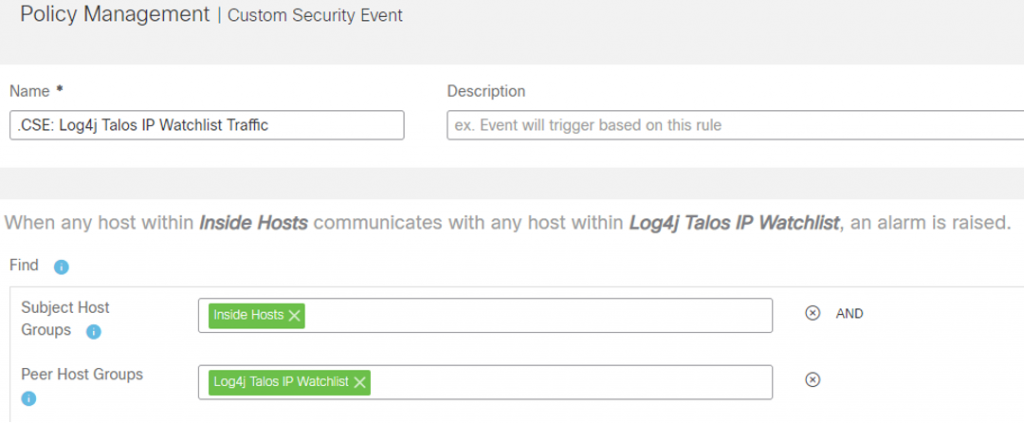 - Click on Save to create the CSE, which will then fire any time traffic is seen between inside hosts and the Talos IP’s in our watchlist host group. Take note of the description that is built inside the CSE describing when it will fire: When any host within Inside Hosts communicates with any host within Log4j Talos IP Watchlist, an alarm is raised.