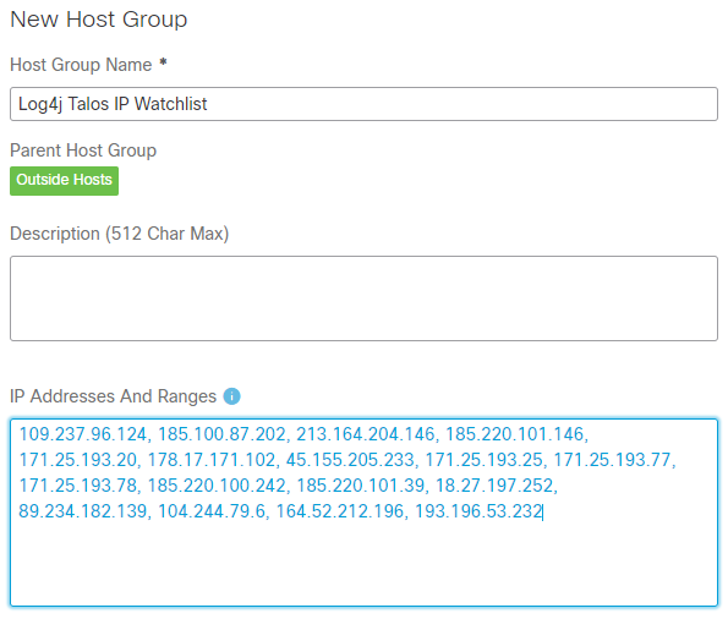 - Enter “Log4j Talos IP Watchlist” (or similar) as the Host Group Name field.