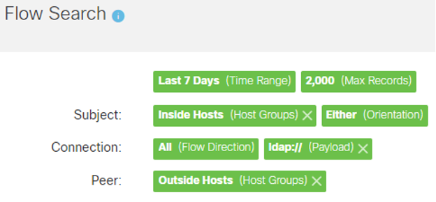 - Click on Search to return any matches for that payload. Please note that legitimate uses of LDAP will appear depending on your environment’s implementation. Look for any unusual requests to servers that are not domain controllers or LDAP servers. You may wish to exclude these hosts in revised Flow Searches. Alternatively, set both the Subject and Peer host groups to Inside Hosts to look for internal exploitation.