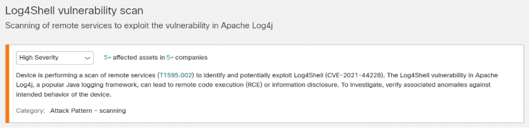 Log4Shell vulnerability scan – this alert checks for outbound scanning which may indicate a vulnerability scan, penetration tests, or exploited devices searching for new vulnerable hosts to exploit. It can be accessed directly at: https://cognitive.cisco.com/ui/threats/3e494958-8fad-4aea-b540-2d6002886bf6