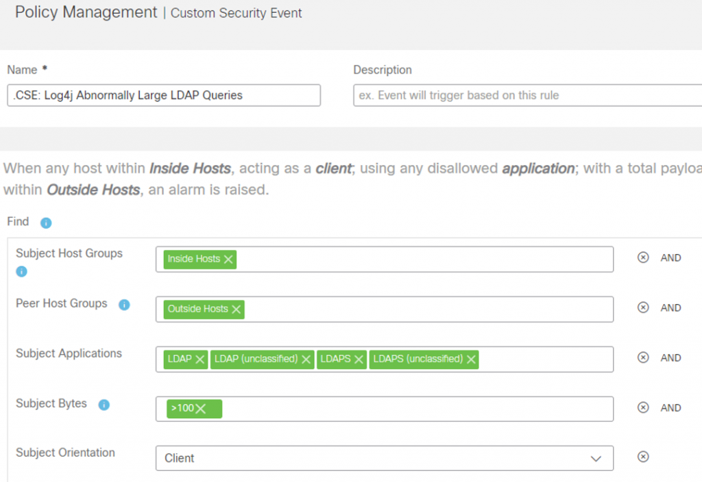 - Click on Save to create the CSE, which will then fire any time abnormally large LDAP requests are made from a vulnerable server reaching out to download a malicious payload. Take note of the description that is built inside the CSE describing when it will fire: When any host within Inside Hosts, acting as a client; using any disallowed application; with a total payload of >100 bytes communicates with any host within Outside Hosts, an alarm is raised.