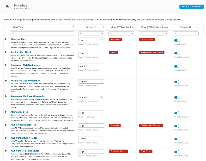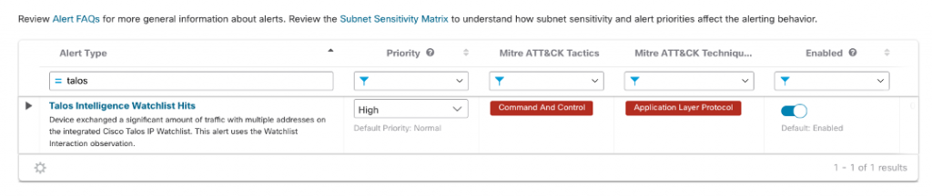 4. We recommend reviewing all alert types, priorities, and whether they are enabled to ensure the detections can be triggered. Because the post-exploit activity could vary greatly, increasing alert priority and sensitivity for many of the tactics and techniques is highly recommended. Delete “Talos” from the search field to return to the complete list of detections for review.