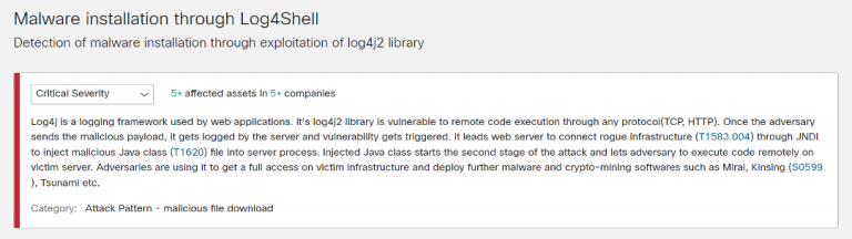 Malware installation through Log4Shell – this alerts monitors for an outgoing response indicating successful Log4j exploitation. It can be accessed directly at: https://cognitive.cisco.com/ui/threats/69ad2359-dc2b-415a-9a0e-d57b4b7aae79