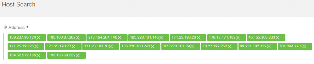 Users should perform a Host Search for the IP’s provided by Talos. The Host Search will report if Secure Network Analytics has ever seen an IP address, and if so, when it was first seen, last seen, the total bytes, and by which Flow Collector.