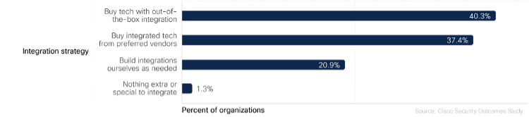 Interestingly, we were surprised to learn there’s virtually no difference in security outcomes between those that buy products with out-of-the-box integrations and those that build integrations on their own. Just under half (~49%) of organizations using either of these approaches report strong integration levels.