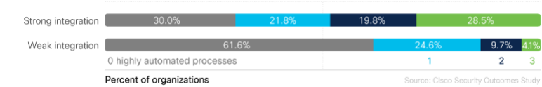 We also wanted to know if having integrated solutions helped with desired outcomes, such as improved automation. Companies with well-integrated security technologies were seven times more likely to achieve high levels of automation for event monitoring, incident analysis, and incident response processes (4.1% vs. 28.5%).