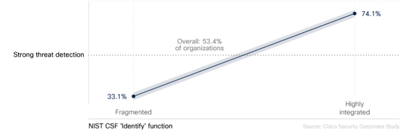 We asked this question focusing on the five National Institute of Standards and Technology (NIST) functional areas (Identify, Protect, Detect, Respond, Recover). While integrating any of these five functions had positive outcomes, the Identify function had the biggest boost.