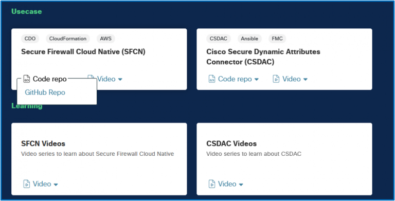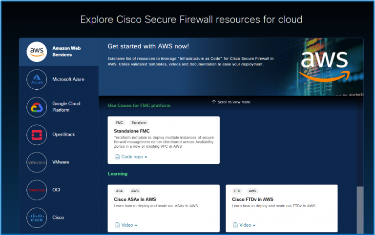 Our new page is organized by cloud provider and specific use case to easily deploy Secure Firewall. It provides flexibility in choosing the most appropriate automation tools, such as Terraform, ARM Templates, Cloud formation, or Ansible. In addition to common use case scenarios, templates and scripts, you also have direct access to learning resources. This includes demo videos, webinars, and sessions where Cisco engineers demonstrate the implementation of the solution in a particular cloud environment.
