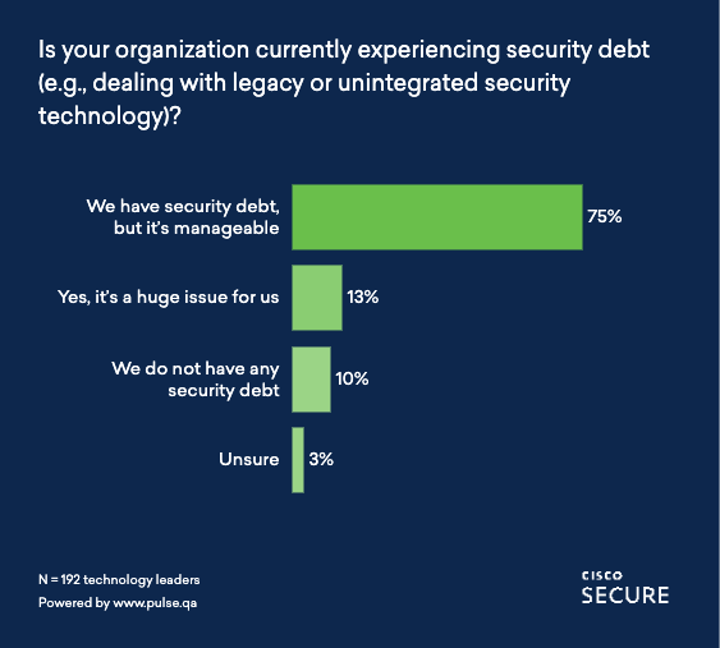 Dealing with legacy or unintegrated security technology, or ‘security debt,’ is a topic we are very passionate about helping our customers to combat, and in this report, our Advisory CISO Dave Lewis discusses why it’s becoming an increasing target of opportunity for cyber criminals. We asked respondents if they were dealing with security debt and to what extent; the overwhelming majority (75%) said they were – but it was manageable. Unfortunately, 13% said that it’s a huge issue for them. Dave’s section contains plenty of advice on how to address this issue in your organization.