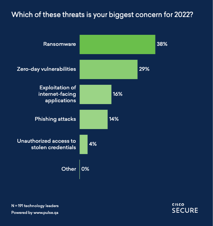 In the survey, we also asked about the top threat concerns security leaders had for 2022. Ransomware came in as the top concern, with 38% of respondents choosing that option. In the report, we discuss the evolution of ransomware and how it has reached a critical level for certain bad actors, provoking a more severe and structured governmental response. You’ll read about this in Matt Olney’s (Talos’ Director of Threat Intelligence and Interdiction) section about the Colonial Pipeline attack.