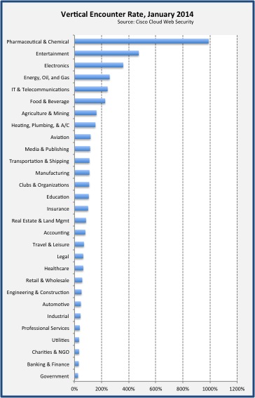 Pharmaceutical & Chemical continuing to experience the highest risk is no surprise. Ongoing Cisco research since 2008 has continually found that companies with the most valued intellectual property tend to have the higher risk of malware encounters. Of particular interest is the increase in risk to the Entertainment industry. This same temporary risk increase has been observed in previous years, right around the time of the Academy Awards.