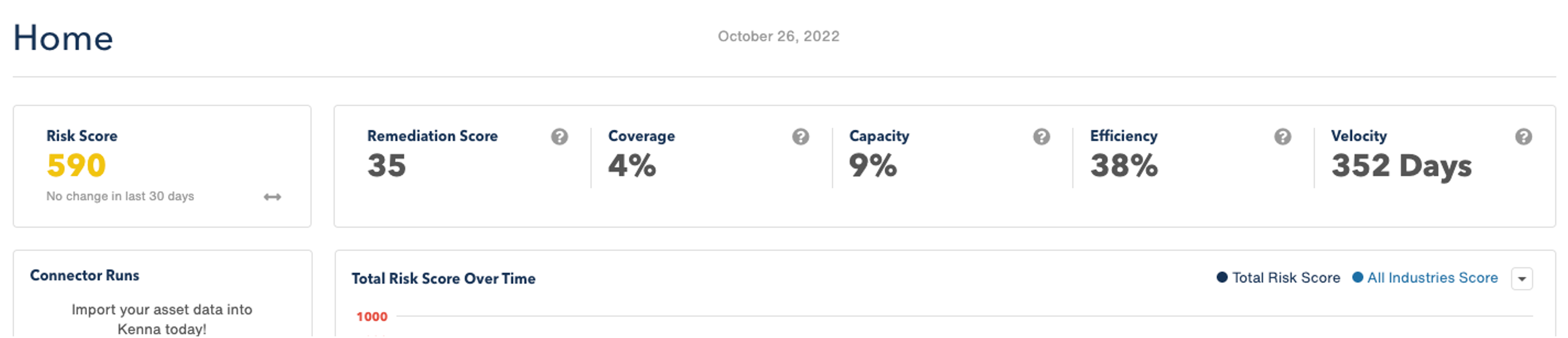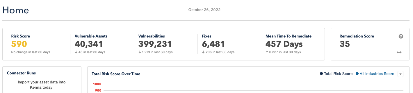 On the Kenna.VM homepage, a new metric will appear at the top right corner (Figure 1). The Remediation Score, as this measurement is known, quantifies how well an organization is addressing risk overall.