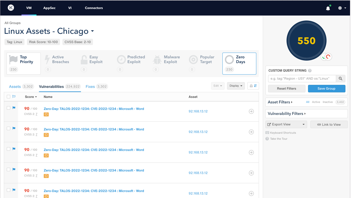 Another new addition to the Kenna.VM platform is zero-day vulnerability intelligence powered by Cisco Talos. Talos regularly identifies high-priority security vulnerabilities in commonly used operating systems and software. The team works with vendors to disclose more than 200 vulnerabilities every year.