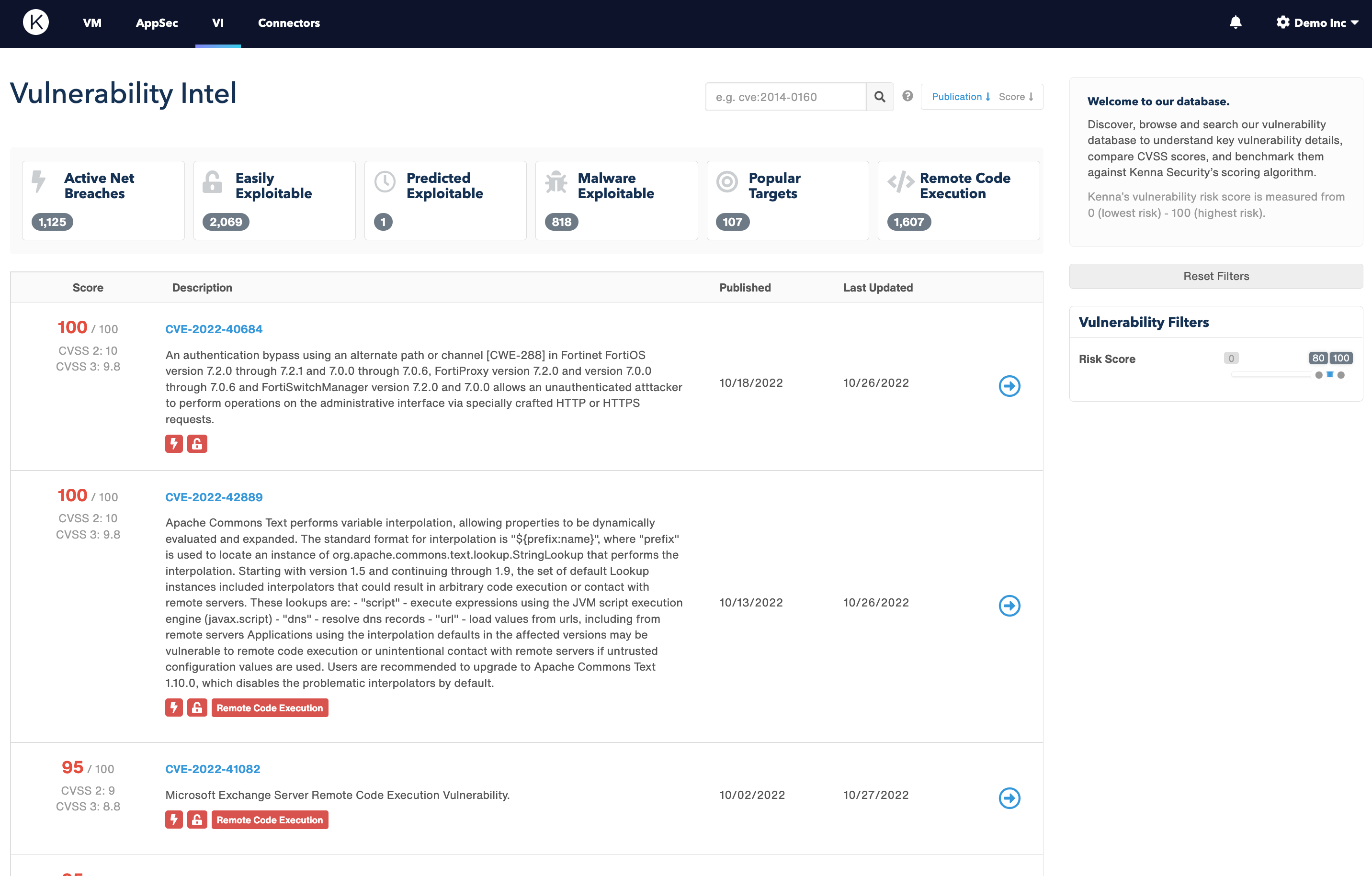 - Access to Kenna’s vulnerability intelligence via an API or user interface (UI)