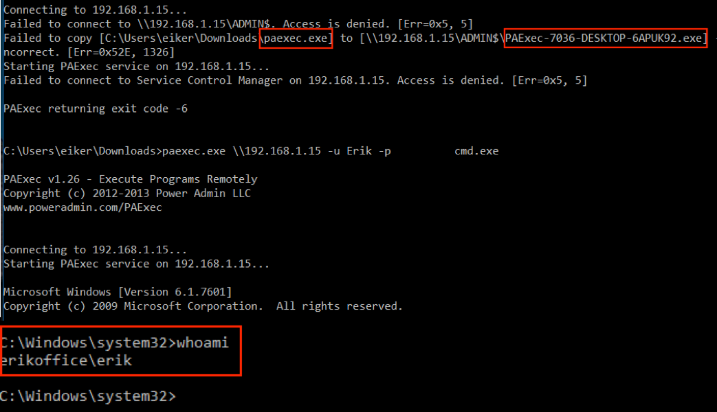 To further illustrate this, refer to Figure 1 below, where “paexec” was run on a machine named “DESKTOP-6APUK92”, with Process ID “7036”, and copied to a computer named “ErikOffice” with IP address “192.168.1.15”. The first attempt at the session in Figure 1 was unsuccessful due to a wrong password, so the name of the binary that failed to copy to “ErikOffice” is highlighted: