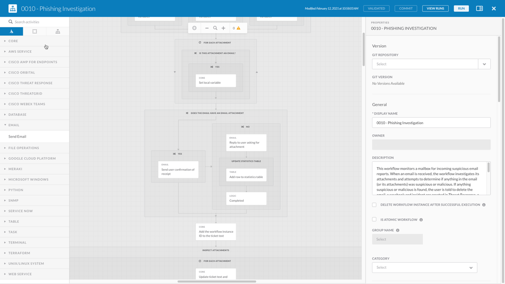 The Phishing Investigation workflow monitors a mailbox for incoming phishing reports. When an email is received, the workflow investigates its attachments and attempts to determine if anything in the email (or its attachments) was suspicious or malicious. If anything suspicious or malicious is found, the user is told to delete the email, a casebook and incident are created in Threat Response, a Webex Teams message is posted, and an email is sent to a SOC email address.
