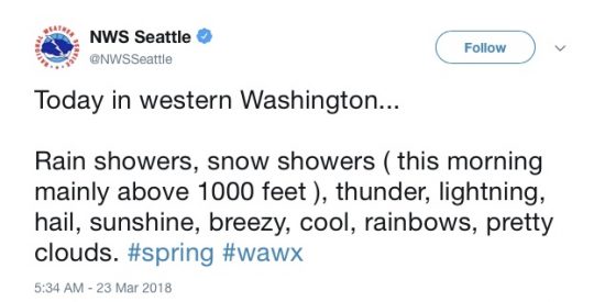 In the Pacific Northwest, the weather, especially in the spring, can be pretty variable. Just look at this tweet from the National Weather Service in Seattle: