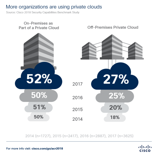 According to the Cisco 2018 Annual Cybersecurity Report’s(ACR) Security Capabilities Benchmark Study, the growth of off-premises private clouds continues unabated, up 50% since 2014 from 18 to 27%, while on-premises environments hold steady, yet grow to 52%.