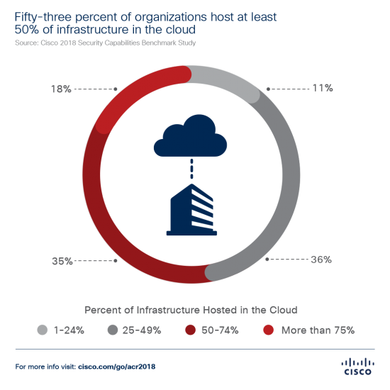 According to the Cisco 2018 Security Capabilities Benchmark Study, 53% of organizations that responded host at least 50% of their infrastructure in the Cloud.