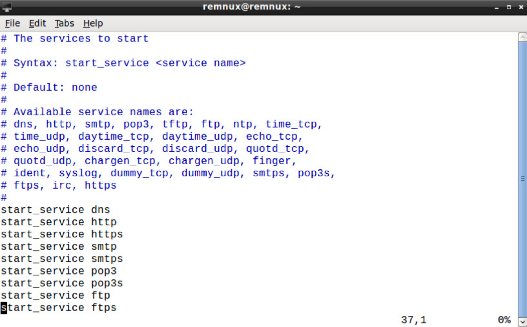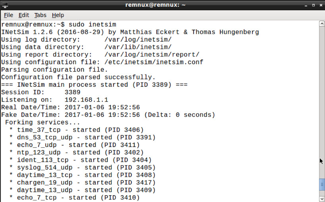 Changes are necessary to the configuration of INetSim to enable all of the services required for analysis. By default, most of the available services are disabled, but you can enable them by uncommenting the appropriate line. I recommend reviewing the configuration and making those changes as necessary.