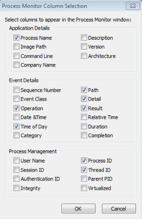 Prior to executing the malicious sample, we need to start our tools to watch for changes. There are two tools which I use for this. SysInternal’s Process Monitor is a tool which monitors the entire system for changes, to include changes to the registry and to the file system via hooks in the Windows API. When a process wants to write the file system, it must make calls to the appropriate Windows API to do so- process monitor identifies these calls and tracks what arguments are made during the call. Details about the processes and their threads are laid out in a table which updates continuously. We can, and ultimately will, output this data into a comma separated value, or CSV, format for ingestion into another product or review in its CSV form. To prepare us for the later use in a tool called ProcDOT, we need to make some minor configuration changes, as seen in Figure 6.