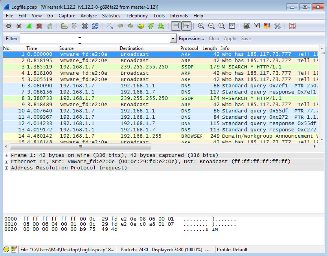 Samples will likely make some form of network communication. To capture this communication, we use the ever-popular Wireshark running on the Windows 7 machine. INetSim needs to be running and communication between the Linux and Windows host must be available for this to work.