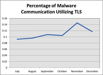 In this blog post, we highlight some of the trends we are seeing with respect to the volume of malware traffic taking advantage of TLS, and on which ports this traffic appears. We compare and contrast malware’s usage of TLS with that of benign network traffic. Finally, we conclude by giving next steps to detect malware even in the face of encryption.