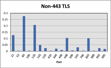 98.25% of the malicious TLS traffic we observed was HTTPS over port 443. But, we did see an interesting diversity of malware’s usage of TLS in the tail of the distribution. Figure 2 shows the percentage of ports where malware used TLS once 443 was discarded. There are some standard ports, such as 993 for IMAP-over-SSL and 995 for POP3-over-SSL. We also observed some unexpected ports, such as TLS over port 53 (DNS) and port 500 (ISAKMP). These results show that a rule-based system, e.g. “port == 443 || port == 993”, is not sufficient to detect TLS traffic for further analysis. Manipulating port numbers is a very low-cost obfuscation strategy that we see being employed in the malware data.