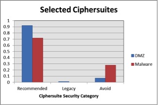 Cisco categorizes different ciphers into categories of Recommended/Legacy/Avoid. These categories are identified in Cisco’s Recommendations for Cryptographic Algorithms. Figure 3 shows the percentages of the categories that we observed in malicious traffic versus benign traffic obtained from an enterprise DMZ. Malware does tend to use weak ciphersuites ~20% more than the DMZ traffic. As an example, the “Avoid” ciphersuite “TLS_RSA_WITH_RC4_128_MD5” was the most used ciphersuite in that category.